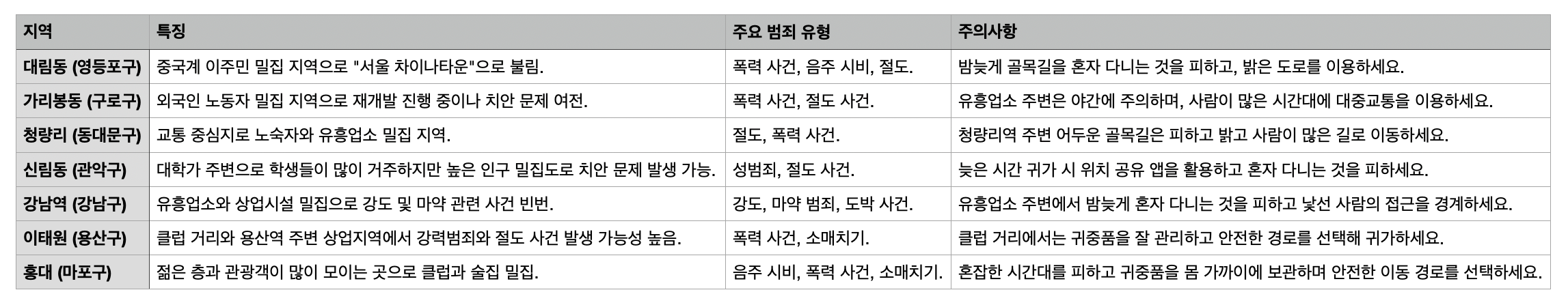 ⛔️서울은 다양한 문화와 경제적 활동이 공존하는 도시이지만, 특정 지역에서는 범죄 발생률이 높거나 치안이 불안정한 경우가 있어서 서울에서의 안전한 생활을 위한 선택을 위해 참고용으로 글을 작성하였을뿐 개인적인 감정은 없음을 알려드립니다. 👀
