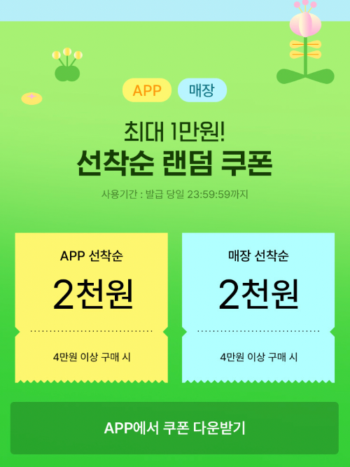 - 4만 원 이상 구매 시 사용할 수 있는 할인 쿠폰 지급.