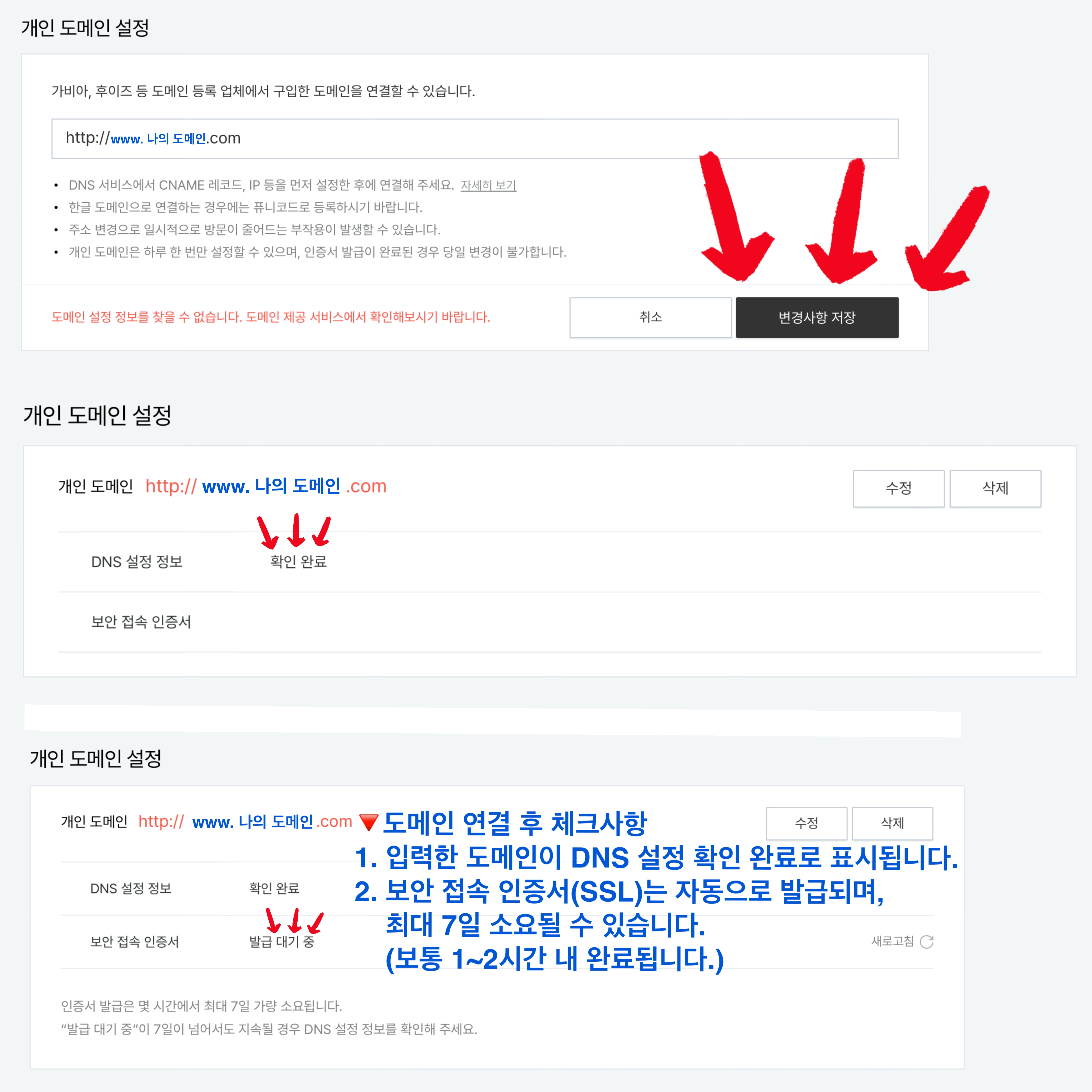 - 등록하려는 개인 도메인 주소(예: www.example.com)를 입력하고 저장 버튼을 클릭합니다.